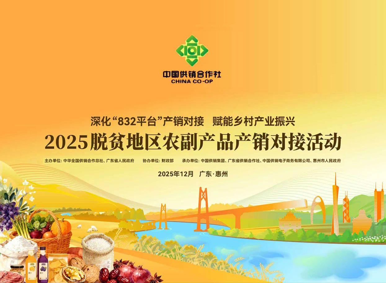 今年是巩固拓展脱贫攻坚成果同乡村振兴有效衔接5年过渡期的最后一年,为深入贯彻落实党的二十届四中全会精神,持续带动脱贫地区农副产品销售和农民增收,依托粤港澳大湾区消费市场优势,强化多元采购主体协同发力,推动脱贫地区农副产品“入湾出海”,2025脱贫地区农副产品产销对接活动定于12月16日至18日在广东省惠州市举办。活动由中华全国供销合作总社与广东省人民政府联合主办,财政部协办,中国供销集团、广东省供销合作社、中国供销电子商务有限公司、惠州市人民政府承办。